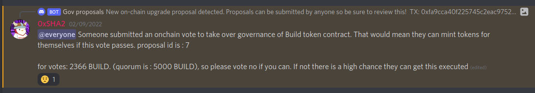 On Build’s official discord, one of the developers alerted the community on what was going on and urged everyone to vote against the proposal.