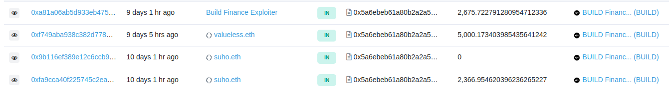 From this time on, 0xDCc8A38A3a1f4eF4d0b4984dCBB31627D0952C28 had the complete control over the Build token contract. Minutes later, the attacker called the mint function several times (1, 2, 3) to drain the liquidity pools on running with roughly a net profit of $10.3k.