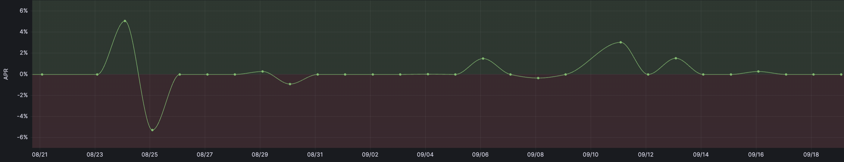 [2] Historical APR of the DOLA/mkUSD BalancerV2 pool. We observe occasional spikes in the APR, likely resulting from sporadic trades routed through the pool. A negative APR accounts for impermanent loss or tokens depeg.