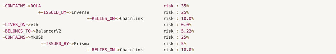 [1] Text-based representation of the DOLA/mkUSD BalancerV2 pool dependency graph, optimized for easier manipulation within our systems. The base risk scores aggregate to 60% at the pool level, classifying it as High risk (with classifications being Low, Medium, High, or Degen).